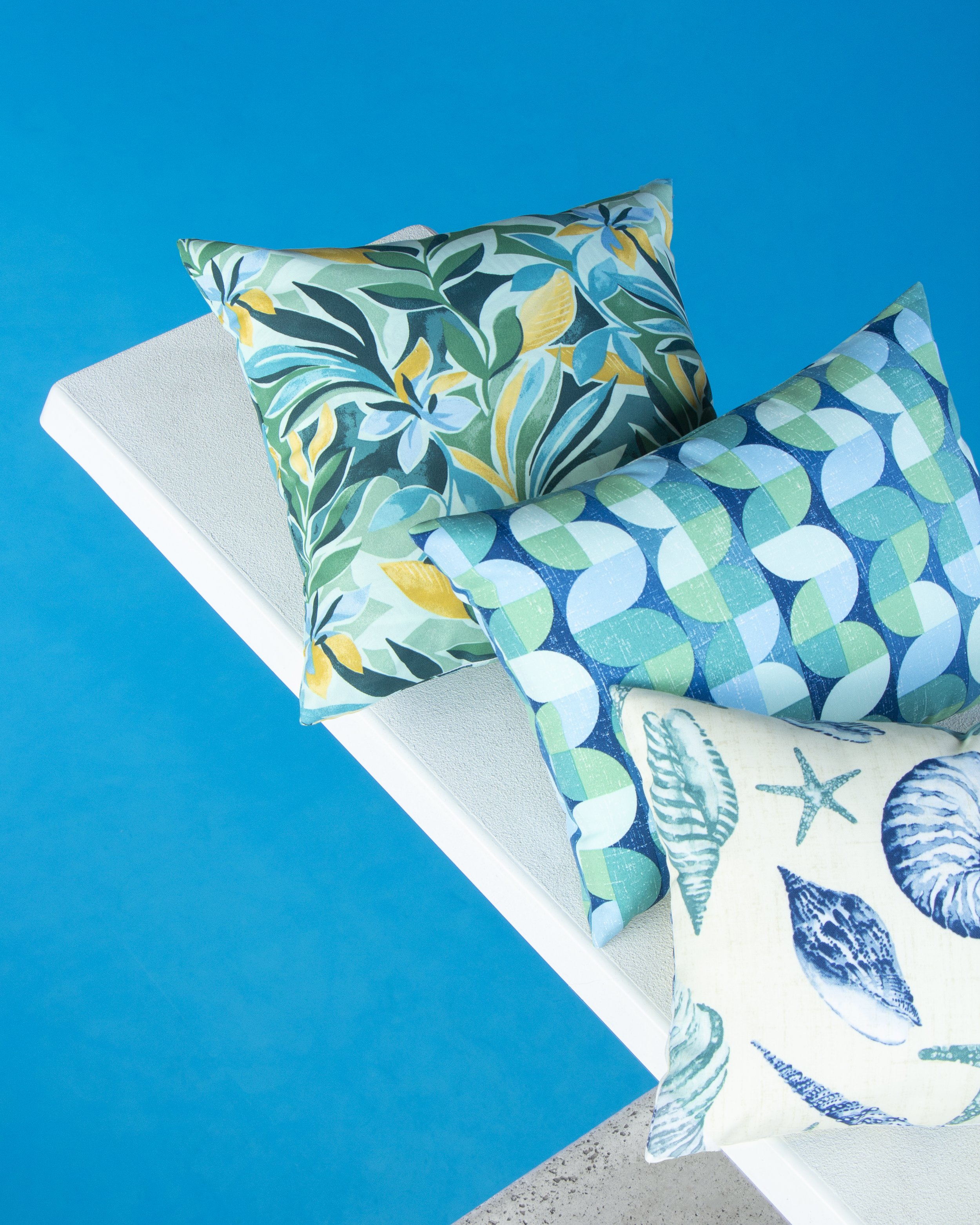 Close-up of four upholstered fabric panels in green, burgundy, green patterned, and orange velvet, placed on a dark metal frame with a painted floral wall background.